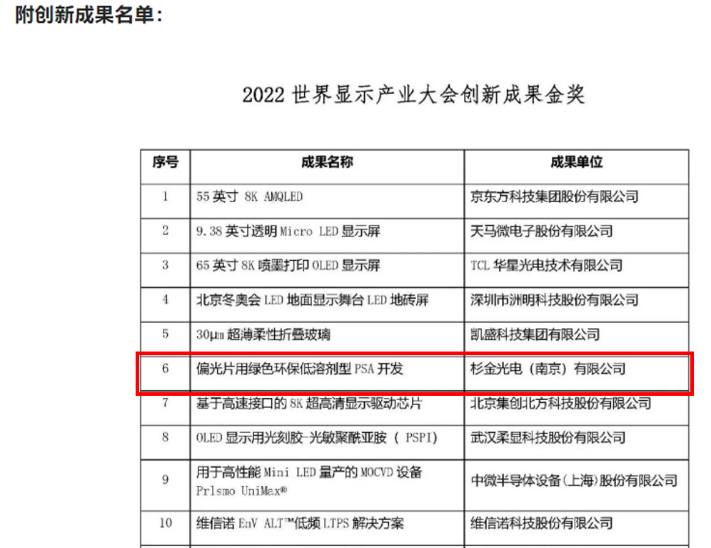 經(jīng)中國光學光電子行業(yè)協(xié)會液晶分會、國際信息顯示學會(中國區(qū))、中國半導體行業(yè)協(xié)會、中國電子視像行業(yè)協(xié)會、中國電子材料行業(yè)協(xié)會、中國電子專用設備工業(yè)協(xié)會、中國OLED產(chǎn)業(yè)聯(lián)盟、世界超高清視頻產(chǎn)業(yè)聯(lián)盟、虛擬現(xiàn)實產(chǎn)業(yè)聯(lián)盟等9家國內(nèi)外重點行業(yè)機構及大會組委會辦公室推薦,專家委員會綜合技術領先性、市場競爭性、應用體驗性,推選出2022世界顯示產(chǎn)業(yè)大會創(chuàng)新成果金獎15項,優(yōu)秀獎30項。其中,杉金光電綠色環(huán)保低溶劑型PSA榮獲2022世界顯示產(chǎn)業(yè)大會創(chuàng)新成果金獎。